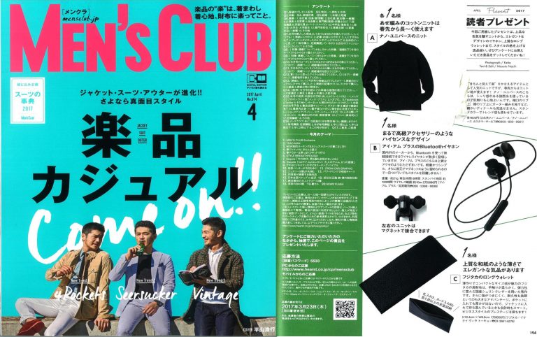 MEN’S CLUB 4月号 MEN’S CLUB 4月号 https://www.iketei.co.jp/wp-content/uploads/2017/02/MEC2-scaled.jpg 2560 1606 株式会社イケテイ 株式会社イケテイ https://www.iketei.co.jp/wp-content/uploads/2017/02/MEC2-scaled.jpg 2017年2月24日 2017年2月24日 2017年2月24日に発売になりました「MEN’SCLUB 4月号」読者プレゼントページに、FUJITAKAの商品を提供いたしております。 P.194 FUJITAKA エルバシリーズ No.625605 長札(札入れ)